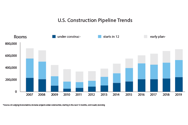 As we move into a new decade, the hotel industry is “a shining star” in the commercial real estate sector, says Bruce Ford, senior vice president, and director of global business development for Lodging Econometrics. “There’s nothing on the horizon that says the hotel industry is going to contaminate itself.” That includes the ever-looming threat of tariffs. “The fluctuation causes people not to act,” says Ford. “They’re not in a rush to make a mistake, so they decide not to decide.” But this has contributed to widespread delays in openings, from 60 to 100 days for the upscale, midscale, and select-service segments to up to five months for full-service, luxury, upper-upscale, and casino categories.