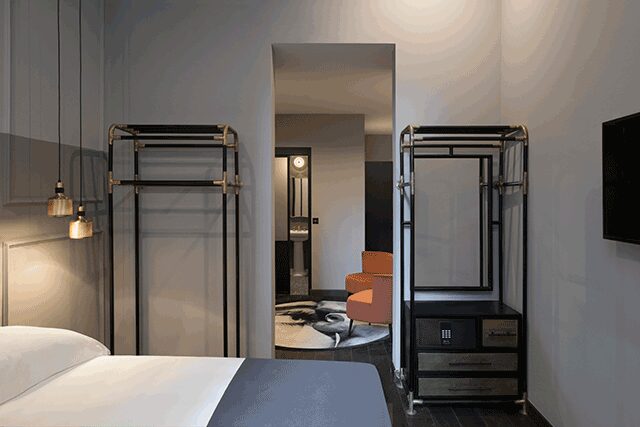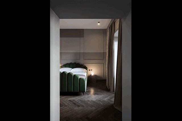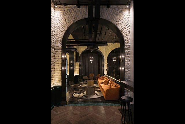 As an updated reimagining of Old World Italia, mixed metals like raw steel, brass, copper, and bronze stand out against exposed brick and vaulted ceilings. “The century-old stripped-away walls are beautiful in all their imperfections,” Plessis says of the guestrooms, with nearly each room featuring plush velvet-lined and Italian midcentury-inspired beds and contemporary furnishings. “The rooms were intended to be comfortable with a pared-down glamour that doesn’t feel forced.”