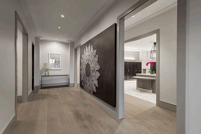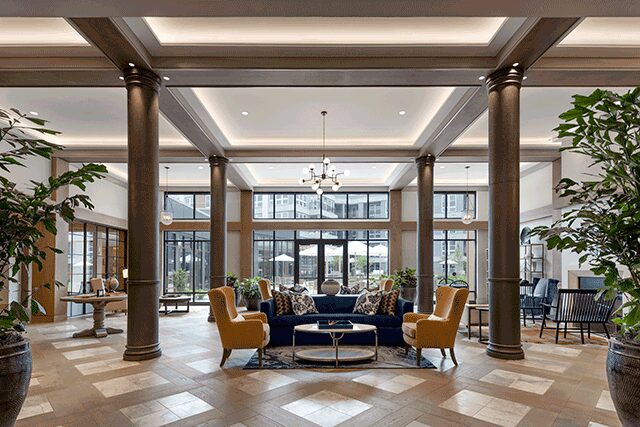 Canvas Valley Forge > Hospitality meets the home at Canvas Valley Forge in Pennsylvania Amish country. The DC and New York offices of ForrestPerkins devised a modern senior living facility that merges charming residential details with a sense of place. The arrival area is scaled down to slowly introduce the property, revealing grand communal spaces anchored by two central courtyards. An understated material and color palette were “intentionally kept light for a fresh, modern, and airy feel throughout,” says senior associate Toby Bishop. Two key factors in the design were personalization—highlighted by a rotating art collection showcasing the residents’ own pieces—and wellness, which is centered on indoor-outdoor living that ensures “the beauty of the space is what leaves an impression,” says associate principal Sharon Bilbeisi.