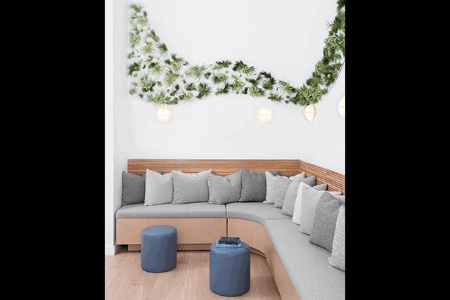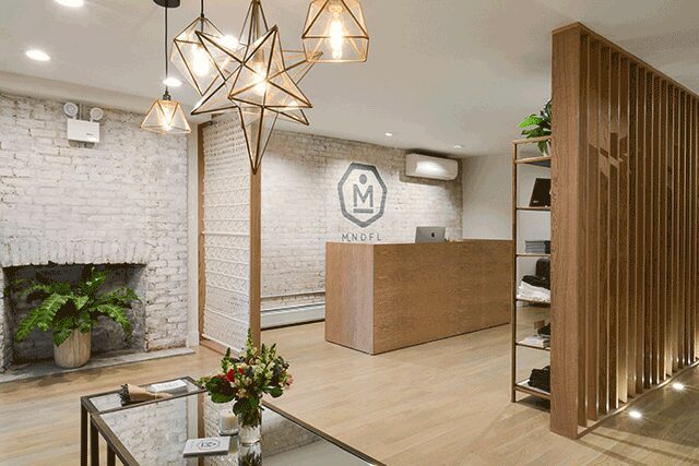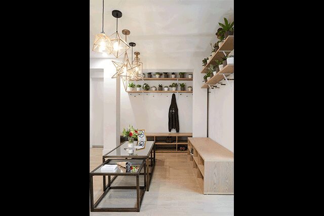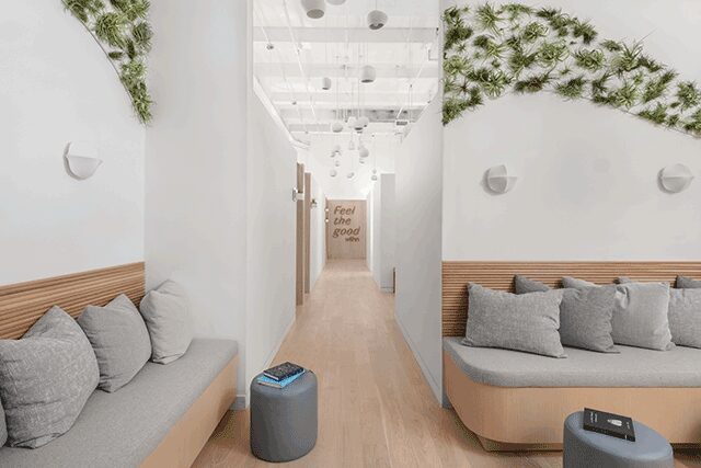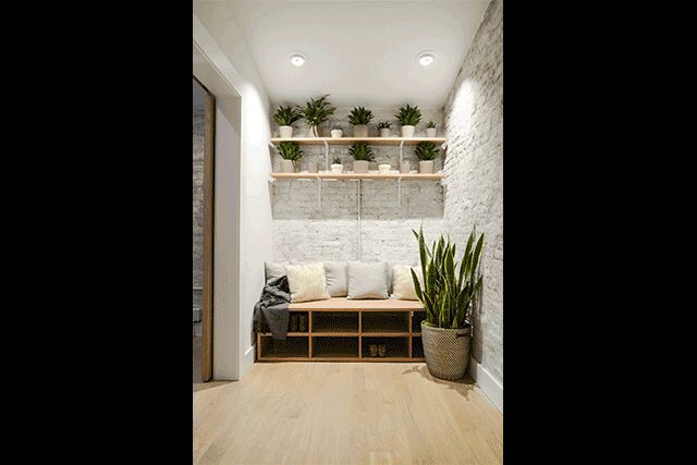MNDFL > Hyphen & Co. founder Shelly Lynch-Sparks was at the helm for New York meditation studio MNDFL’s three locations in Greenwich Village (a collaboration with local firm Bright Architecture, pictured), the Upper East Side (also the handiwork of local firm Taylor and Miller), and Williamsburg, Brooklyn. As a nod to the brand’s mission, she infused each serene space with plants for a lived-in, back-to-nature feel. Wooden benches in the reception areas and lounge spaces double as cubbies to hold belongings during sessions, while white oak and whitewashed brick “keep the palette neutral and soft,” says Lynch-Sparks. In one studio room, natural light pours in from skylights to highlight a dramatic green wall installation—a brand staple.