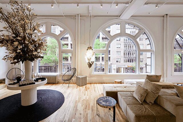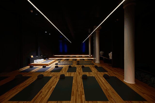 Humming Puppy > After transforming the yoga experience with its unique humming sound wave classes in both Sydney and Melbourne, Humming Puppy looked to Manhattan for its first studio outside Australia. Melbourne designer Karen Abernethy teamed up with Brooklyn-based firm Mesarch Studio on the project, which accentuated the building’s original details, such as 15-foot-high vaulted ceilings, steel Corinthian columns, and arched windows. Neutral tones, natural materials, and minimal lighting amplify the soothing aesthetic in the lobby, while other spaces are delineated only by floating curtains for an ethereal quality. From the outside, the self-contained ebony-dipped studio rooms “appear to be a floating mirrored volume that reflects its surroundings,” says Abernethy.