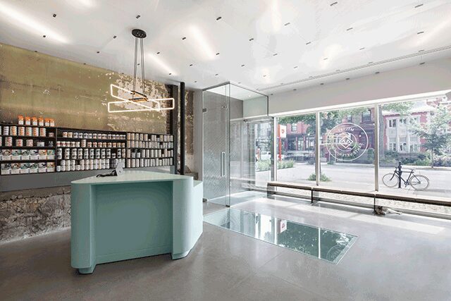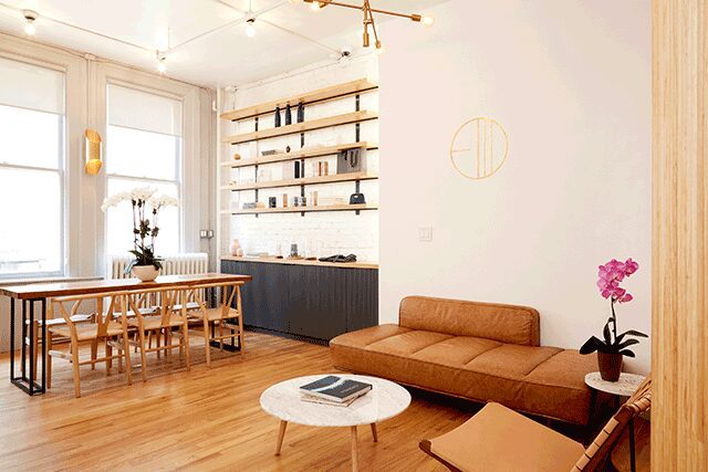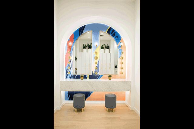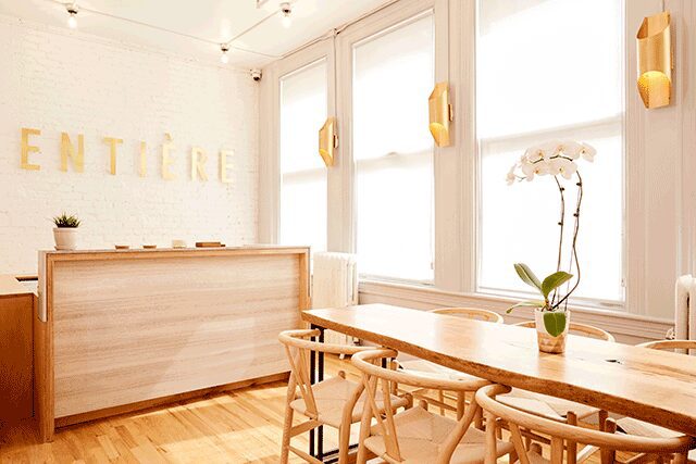Entière Dermatology > When taking the leap to open her own dermatology practice in Manhattan’s Flatiron district, Dr. Melissa Kanchanapoomi Levin was led by her belief that “the pursuit of skin health and wellness should be democratized in a simple, beautiful, and natural approach,” she says. Working alongside creative designer Venessa Rosely and architect Thomas Barry, principal of Brooklyn-based Opera Studio Architecture, the 2,000-square-foot loft space includes seven treatment rooms, a waiting area, numbing/meditation lounge, a storage area, lab, and staff offices. Glass, wood, and plaster surfaces “peel away to reveal the layer below,” Barry says, shaping treatment rooms, a curated product bar, and custom terrazzo-topped vanity. The waiting room’s Scandinavian-inspired design highlights the gold “Entière” sign above the reception. It means “whole” in French, says Levin, “which is how we approach patient care.”