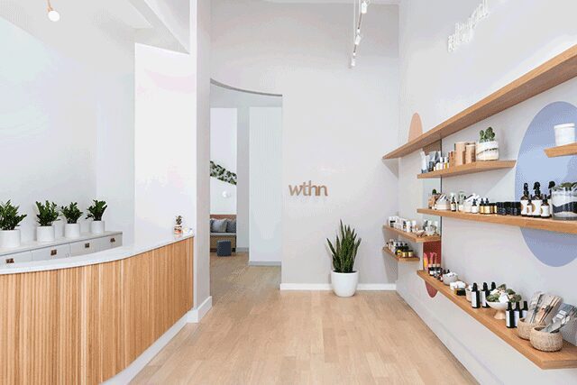 WTHN > For acupuncture studio WTHN’s first location in Manhattan, founders Michelle Larivee and Dr. Shari Auth tasked New York firms Shadow Architects, Hyphen & Co., and branding agency Fuzzco to develop a concept with “a good amount of curb appeal and a playful attitude, but also a spa-like tranquility,” says Shadow Architects principal Larry Cohn.“The spaces change in scale and design as you progress through the environment and are reinforced with the use of textured materials and lighting.” Oak and brass elements juxtapose neutral-toned fabrics and whitewashed walls in the lobby, where a striking tambour- and marble-clad reception desk welcomes visitors.