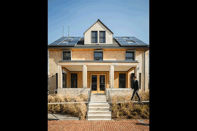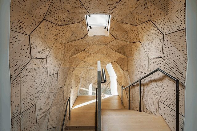 HouseZero > Snøhetta’s design for Harvard University’s Center for Green Buildings and Cities was no easy feat considering it was a refurbish of a house that predated the 1940s. With the goal to be a living laboratory and an energy-positive prototype to combat inefficient existing buildings, the house is intended to produce more energy over its lifetime than was used to renovate it. Forgoing an HVAC system, the building will adjust itself to reach thermal comfort targets for its occupants using nearly 300 sensors embedded throughout that will collect millions of data points on such variables as outdoor air temperature, rain, and indoor carbon dioxide levels for researchers to better understand how buildings work. Producing zero carbon emissions, the project also boasts 100 percent natural ventilation—helped by an outdoor solar chimney and a spiral stairwell dressed in hexagonal panels finished by students at the Harvard Graduate School of Design. In addition, the open floorplan and lighter-colored materials means the house doesn’t need electric light during the day.