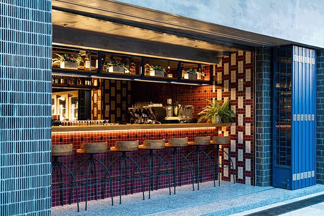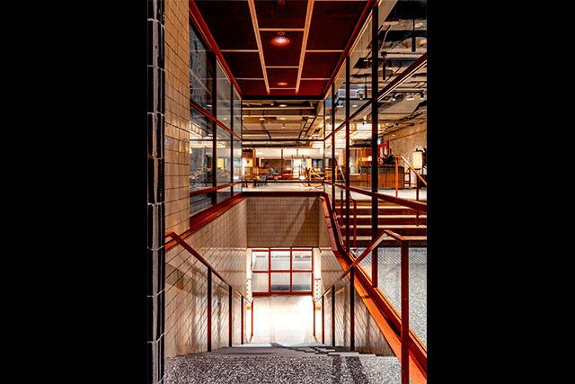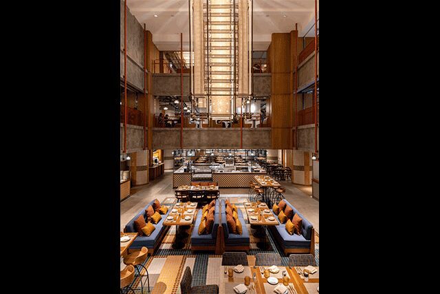 The firm stripped back the design of the 1970s-era former hotel to its bones “and left much of the structure exposed in certain areas,” says Bradshaw. To contrast the raw, industrial feel, ceramic tiles create vibrant color-blocking moments with red powdercoated steel details recalling the local architecture. Clad in linen and steel, the oversized atrium chandelier is another nod to the area’s design vernacular, taking cues from the local bamboo scaffolding.