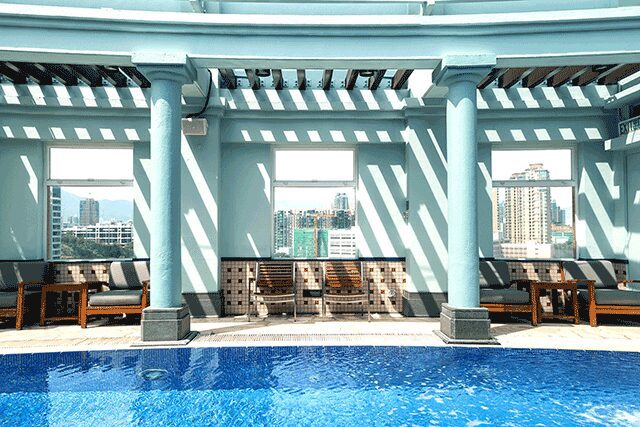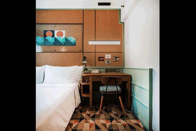 Guestrooms are fun and quirky, from the bathroom’s playful patterned tile that references Hong Kong’s tiled skyscrapers to the headboard wall, covered in corkboard and featuring local artwork. “The most impactful change was adding the geometric patterned carpeting,” says O’Neal. “The colors and design present a nice tension between the past and the future.”