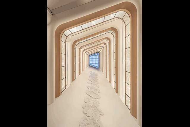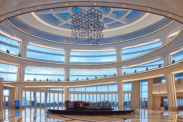 Atlantis Sanya > Located along Haitang Bay, the Atlantis Sanya is a massive 1,314-room hotel (with five underwater suites) that spans a waterpark and retail and restaurant collection. Sibling to Atlantis Ko Olina in Hawaii and Dubai properties Atlantis, the Palm, and the forthcoming Royal Atlantis Resort & Residences, this outpost depicts the ancient myth of Atlantis via a 48-story building with an undulating façade united by two fin-like forms thanks to architecture firm HOK. Featuring a podium envisioned as spiraling vortexes of water, the tower maximizes ocean views in guestrooms and illuminates a connection to the aquatic life that is “both symbolic and literal throughout the property,” says Greg Cranford, senior principal at HOK’s New York office. Having worked on the Dubai resort, Jeffrey Beers, principal and founder of New York-based Jeffrey Beers International, was already immersed in the Atlantis ethos, but for Sanya’s interiors, it was time for a “new and futuristic narrative that was aimed at a completely different demographic,” he says. Studying the South China Sea’s marine life led to dressing public spaces and corridors in deep blue and turquoise and etching purple sea fan coral and Chinese lacebark elm onto glass and bronze surfaces. Zitan, Hongmu, and Jichimu, hardwoods native to the province, were also embraced.