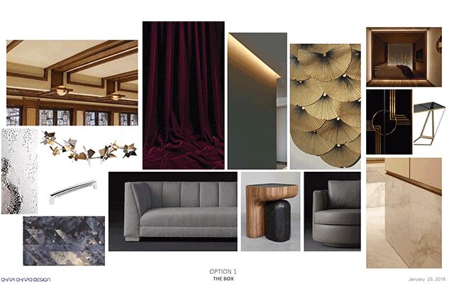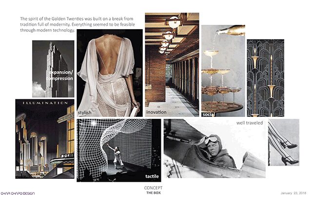 The spirit of the 1920s is captured in Chapi Chapo’s moodboards, which helped the firm win the inaugural Box design competition.