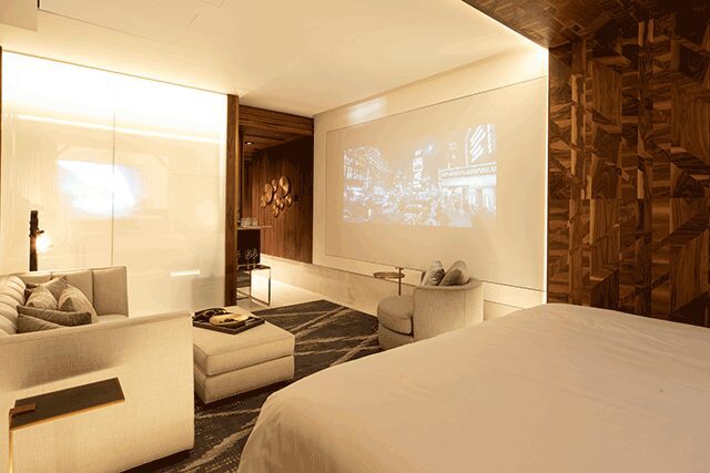 Indeed, Chapi Chapo chose an immersive approach, merging the living area with the bedroom and connecting the bathroom through a glass partition that can go opaque (plus, it is embedded with a tablet, allowing guests to watch shows from the bathtub or bed). In fact, technology was key, foregoing a traditional TV for a projection screen that covers a wall doubling as the room’s main entertainment-work hub and art wall.