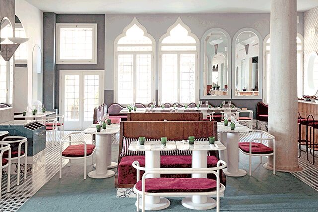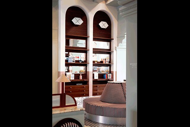 On the ground floor, Meilichzon called on colleague and friend Cristina Celestino to design the first Experimental Cocktail Club outside of Paris and London. Adriatica Ristorante—a partnership with Italian Supper Club founders Silvio Pezzana and Toto Dell’Aringa—is a spacious and bright space, enhanced by the palazzo’s preserved Gothic windows and a bright color palette, including a pale green hue that covers the ceiling and reflects the lagoon. “From a design point of view, the restaurant is my favorite area. We did a lot of work to make it very luminous,” Meilichzon says, pointing to both the Breccia Capraia marble and the terrazzo Scarpa as some of her favorite elements.