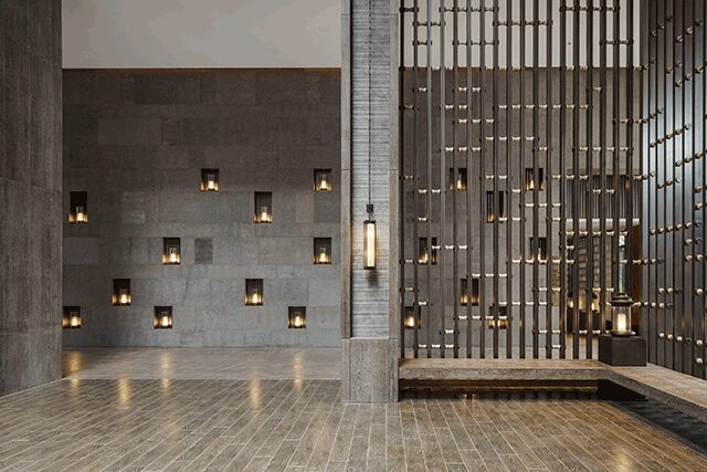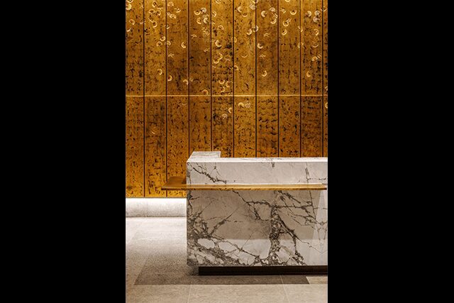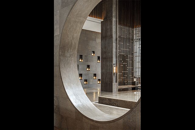 Lim adds that the unique aspect of the spiritually charged site demanded a response that sets it apart from typical hospitality settings. Indeed, the main feature of the hotel is its peacefulness, reinforced through the contextually driven design. “Upon their arrival, guests are welcomed by a 23-foot-tall gingko tree installation, but what they don’t notice right away is that the artwork is surrounded by water,” he says. “When it is quiet, you can hear the trickling sound of water.”