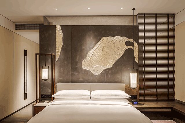 The theme of contemplative tranquility runs throughout the hotel. Public spaces on the first floor replicate the scholar hall at the Confucius Temple with a stone relief depicting tales of Confucian history, while the lobby emulates an outdoor courtyard outfitted in slate tiles, gray stones, and bronze lattice with ceramic ornaments. To further strengthen the feeling of down-to-earth luxury and express the philosopher’s teachings on humility, Lim chose materials like wood and bronze, combined with neutral shades of gray, white, and brown.