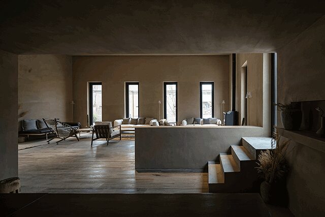 “We try to hide artificial traces in design and let people get involved naturally,” says Li Jingze, DAS Lab’s founding partner and creative director. For the façade, Jingze was challenged to find a material durable enough to withstand sandstorms that still “shows our respect to local architecture.” By mixing mud with mortar, DAS Lab was able to simulate rammed earth and conjure a “beautifully old” exterior, he says. Inside, the understated units feature concrete, terrazzo, and wood veneer. All have different layouts, guided by the strategic placement of floor-to-ceiling windows that magnify outdoor views. Like the structures’ shade-inducing reed canopies outside, the windows allow guests to witness the interplay between light and shadow. “When encountering views in an unexpected way right in the room,” says Jingze, “people might be inspired to rethink their relationship with the space and nature.”