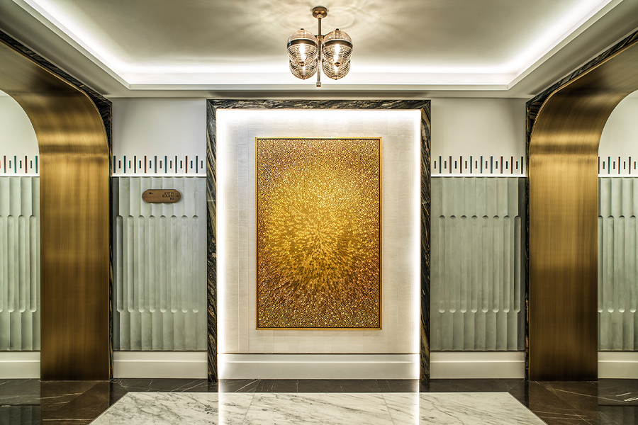 Take the entrance. Its massive columns instill a “stoic, imposing” air, as Littlefair puts it, “a scale that speaks to the grandiosity of the building. We kept unpeeling the details, understanding what we needed to keep, reinterpret, or conceal.” The original flooring in the same area, for example, now hides underneath marble, but the waffle ceiling, its grids punctuated with lighting, is buoyed by fresh dentils and reblown glass casings that shimmer like water.