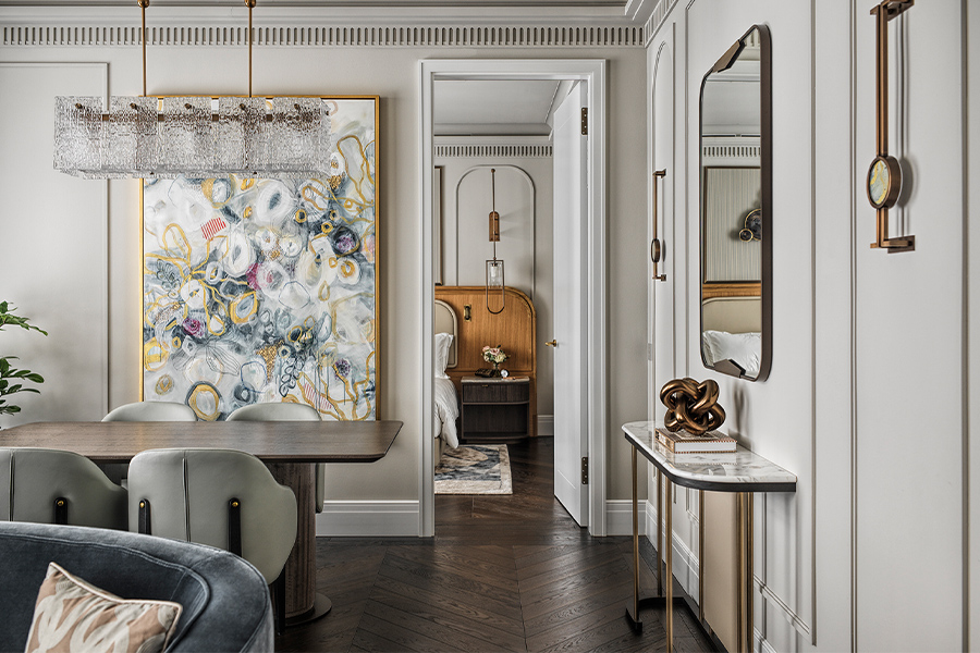 Likewise, the 138 guestrooms—there are also 25 residences on the top three floors—were designed as hushed Viennese apartments with bespoke furniture, including “seating that just wraps around you,” says Littlefair, and crisp marble contrasting with soft hues of gold, oyster, and pastel blue and pink. “We chose to not make the bathroom full-height, wall-to-wall marble. There is a marble mosaic floor and marble on the countertops, but we intentionally left some areas half painted with a little dentil detail running around the ceiling. Putting that layer in was a much more realistic approach, less harsh and cold,” Littlefair elaborates.