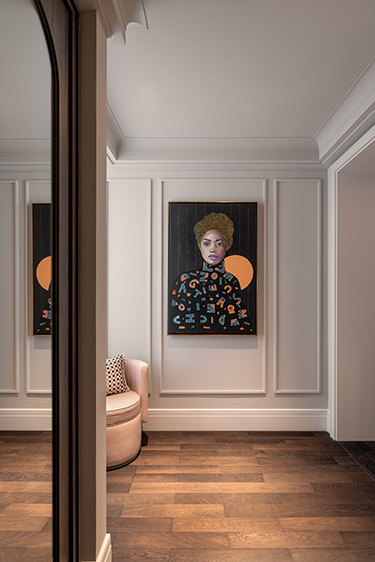 The hotel unfolds like a private residence. The salon-like lobby sets an intimate tone, backdropped by a luminous hand-embroidered installation from London artist and surface material supplier Fameed Khalique. Inspired by a Koloman Moser glass panel, it was brought to life by 17 different artisans who melded metal yarns with brass, glass beads, and crystal stones into a swirling motif and hints at the impressive collection of artworks gracing the rest of the hotel.