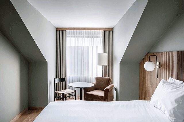 Soho House imbued the pale green-hued guestrooms with “a simple and stylish feel, making sure the rooms had all the things that makes staying in a hotel room enjoyable,” says Lok. Wood slatted headboards, spherical light fixtures on walls, and burnt-red velvet chairs outfit the spaces, which include a handful of suites and interconnected bunk-bed rooms suited for families.