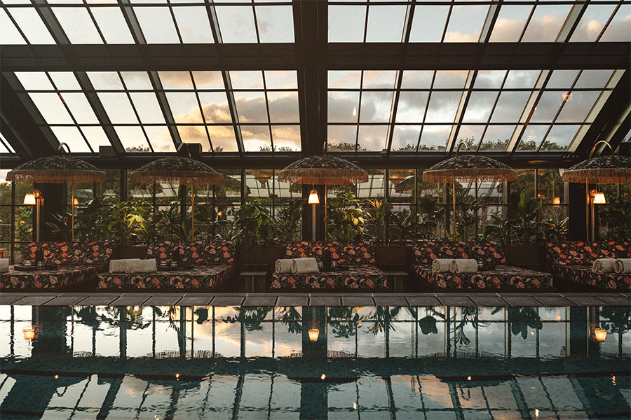 In practice, this meant using marble, wood, stone for the floors, and a traditional Mayan stucco on the walls. “There is not one single space covered or painted,” he says. Bamboo stools accent concrete tables that are topped with ceramic vases holding native plants, while cotton satin bedding is courtesy of Octavia’s homewear line. To contrast the soft interiors, the design team filled exterior spaces with various textures, including big leafy plants and gravel paths.