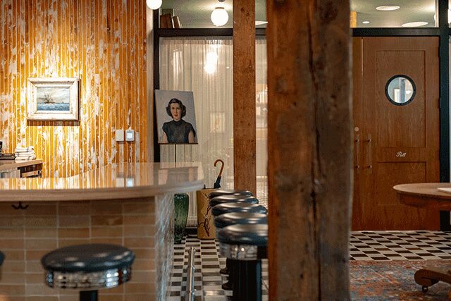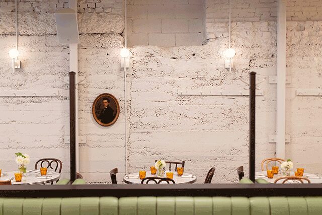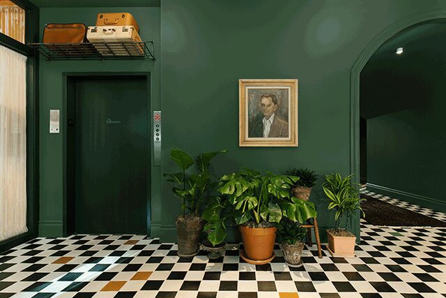 Green also reigns in the communal spaces. Both the reception and lounge feature emerald walls where honey-tan leather sofas surround driftwood coffee tables. A black and white checkerboard floor leads to the restaurant and coffee bar zone where green is swapped for whitewashed exposed brick. “We used wood detailing and lighter paint colors to emphasize the high ceilings within the space, so even when the weather is dark and gloomy, it feels inviting,” says Brosh, who modeled the eatery after the city’s famous public market. Even here, green sneaks in. Indeed, elegant banquettes in sage create color continuity.