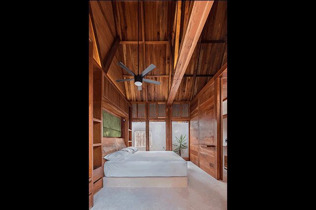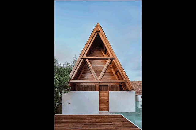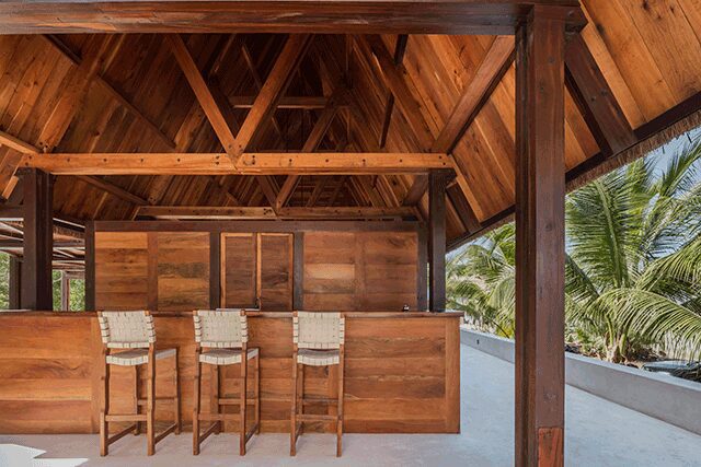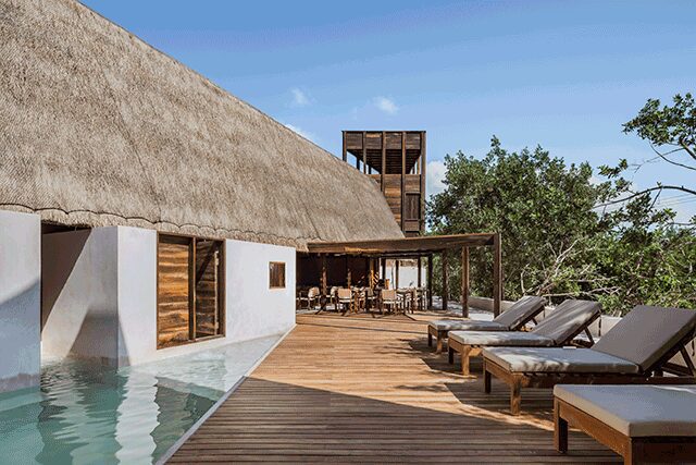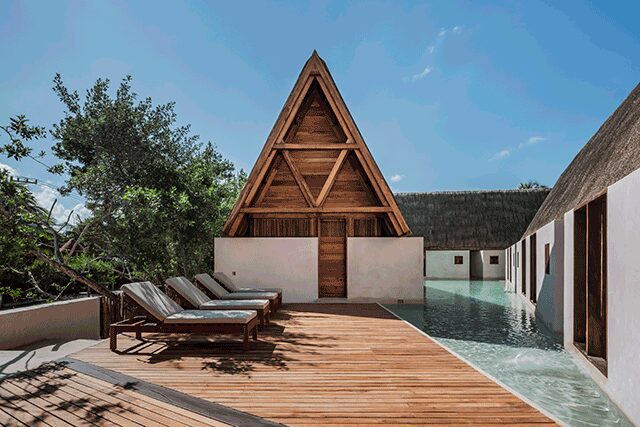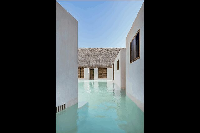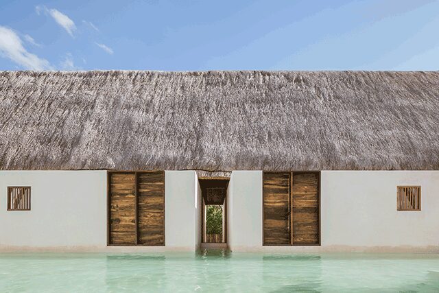 The details: Merging harmoniously with the sea, the family-owned Punta Caliza is situated in Isla Holbox, a fishing village off the Yucatán Peninsula in Mexico that’s only reachable by ferry. It’s partially the vision of Claudia Muñoz, an architecture student at ITESO – Universidad Jesuita de Guadalajara, who introduced her parents (also the hotel’s developers) to her professors Magui Peredo and Salvador Macías Corona of Estudio Macías Peredo, which proved to be a fateful event as they charged the architects with crafting the island retreat in homage to the area. “The small hotel emerges from the site to negotiate with rising sea levels on an unstable island or it anticipates this with its drowned cloister, depending on the viewpoint,” explains firm cofounder Macías Corona. Channeling Mexico’s ancient Mayan buildings, traditional courtyards connect the different buildings that house each of the 12 guestrooms, and the duo chose materials firmly rooted in the culture, such as thatched roofs, limestone floors and walls, and chukum—a Mayan stucco commonly used to seal water reservoirs. For a truly authentic touch, the rich, intricate woodwork found throughout is made with cedar from Muñoz’s tree farm. But what makes the property even more unique is the fact that guestroom plunge pools link to a main canal that’s also swimmable, making the white structures feel like they are floating on water.