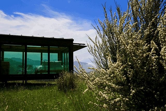 It isn’t until guests book a stay in one of the minimalist, glass-enclosed PurePods that directions to the off-grid location are revealed—the four solar-powered homes are scattered across New Zealand’s South Island, either near the Kahutara River, along the Seaward Kaikoura Range, above the Little River township on the Banks Peninsula, or nestled in the Waipara wine region (the newest location). With unparalleled views of the country’s vast landscape, it’s a roughly 15-minute walk from where guests park to the secluded, wifi-free zone. Designed in-house and led by director and founder Grant Ryan, the team wanted “to ensure we had the smallest possible footprint on the pristine landscapes,” says CEO Stephanie Hassall, “which is why the PurePod is suspended above the ground on steel footings with a glass floor to allow the plants to continue to grow below.” To make the pods accessible year-round, the structures have “custom designed (and patented) heating embedded into the glass floor,” Hassall adds. Sliding doors open to a deck where a telescope and a star map ensure that “even novice stargazers can have fun,” she says, or guests can choose to stay tucked in bed and gaze up at the sky through the glass ceiling.