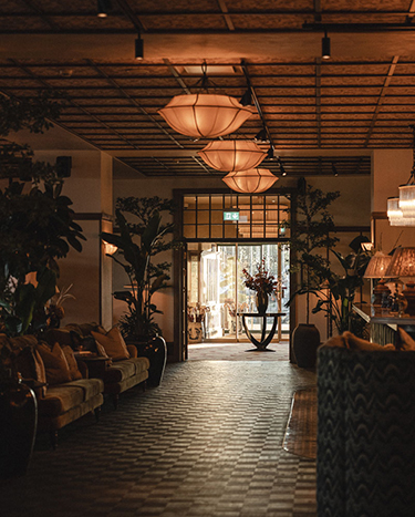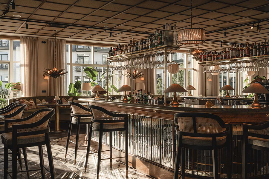 Upstairs, cocktail lair the Birdcage awaits. “It’s not hidden, because it’s a huge glass room, but it’s also at the end of the hotel, so it’s a bit of a hideout that you need to discover,” explains Spik Studios interior designer Simon Poulsgaard. Sofas instill a classic salon vibe but brick flooring and the bar’s maximalist floral motif pull in the outdoors.