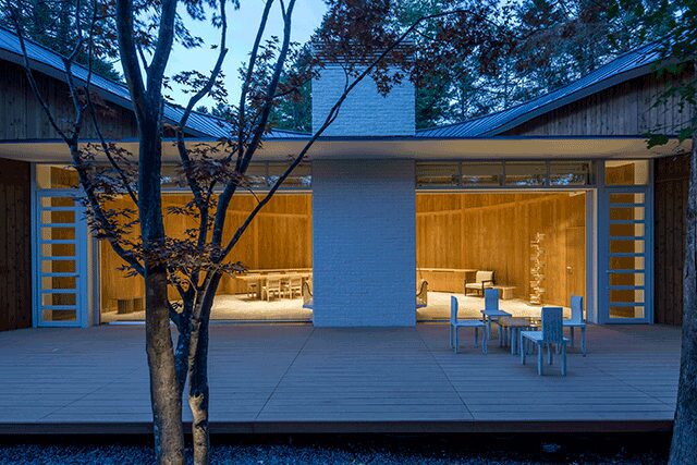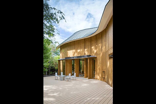 Just an hour train ride from Tokyo in the foothills of Mount Asama is the resort town of Karuizawa, now home to the 10-room Shishi-Iwa House from Shigeru Ban Architects. Constructed from natural and nonintrusive materials, the wood- and glass-clad restorative retreat invites visitors to be completely immersed in nature instead of spoiling it. “There were many big trees in good condition onsite, which I did not want to cut,” says Pritzker Prize-winning architect Shigeru Ban. “I made the buildings narrow and curved for placement between the trees.” Wood frames were sandwiched between prefab plywood panels, and a pitched gable roof allows for rain to run off without obscuring the architecture. This form is repeated indoors, as well, with rhythmic wooden trusses that follow the roof line. The verdant landscape is, of course, brought inside thanks to double-height, wood-framed glass doors, while the reception area and library open to a garden, which features more than 250 species of trees. “Shishi-Iwa House is for anyone seeking a place to rest, to think, and to reflect, and who is still interested in a social hospitality experience,” says Ban.