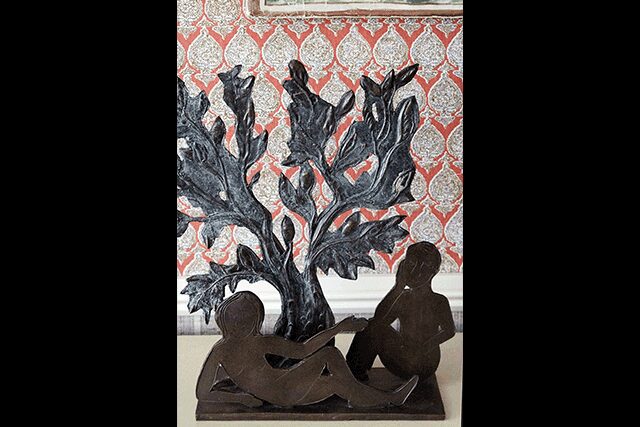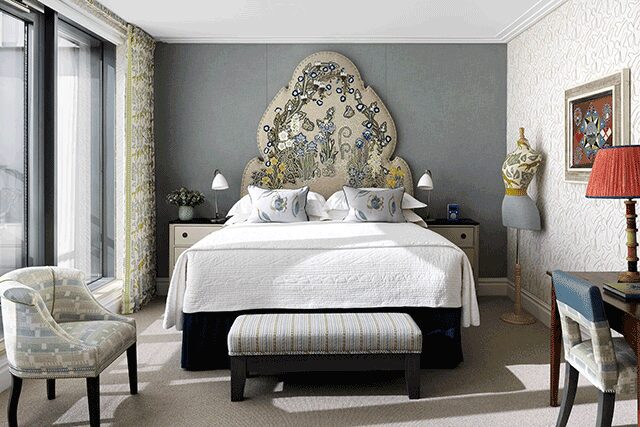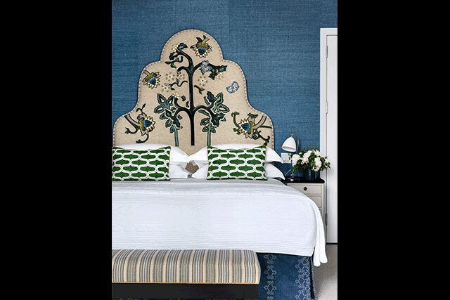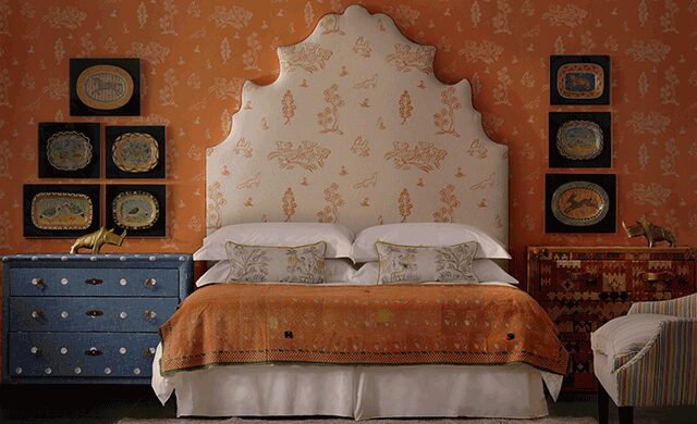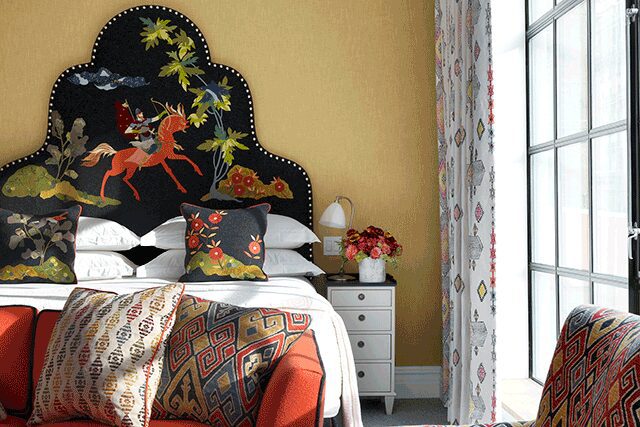 We worked with Natasha Hulse once again to help craft the master bedroom in the Whitby suite. The space comes alive with her exquisitely hand-embroidered headboard. The height adds excitement, while its vibrant colors and textures create a dramatic palette. Cushions in the vivid green of Seema Krish’s handblocked and embroidered Juhu fabric marry with Hulse’s bespoke and appliquéd headboard. It is a magnificent Tree of Life design with little beads sewn onto the leaves, appliqué butterflies, and 3D centers on the flowers. These tiny details bring the room to life and show a true skill in the craft. You can almost imagine the artisan’s hands working over the fabric—it’s all in the details. Natasha was at school with my daughter Minnie, and it has been a pleasure to watch her grow into an accomplished designer. This is one of the joys of my job, watching the progress of talented designers and artists who have grown up around me. It is like watching a beautiful butterfly emerge from its chrysalis.