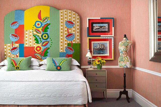 The Charleston Flowers headboard is inspired by the Bloomsbury Group and the works of Vanessa Bell and Duncan Grant. They were the original artists of the Omega Workshops that opened at the beginning of the 20th century. Started by Roger Fry (who brought the first post-Impressionist art exhibition to London), they have been rich pickings for inspiration, and their color palette looks perfect through the English light.