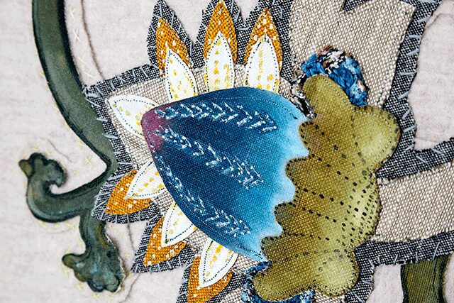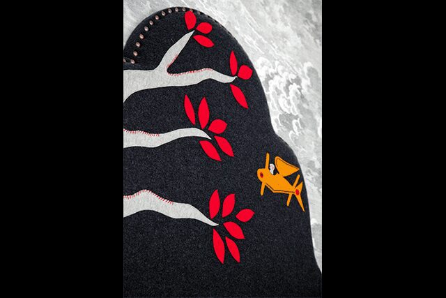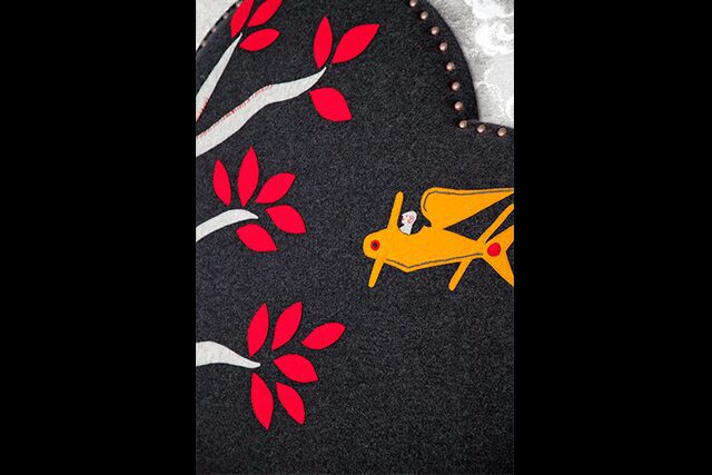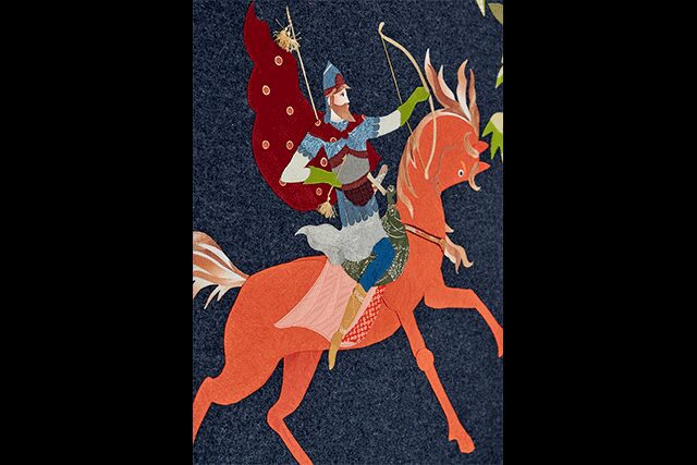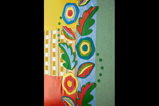This headboard was inspired by an illustration I saw of a huntsman in the woodlands on the top of an old Russian black-lacquered box. Kumi replicated the design using appliqué and embroidered remnants of the old and damaged textiles. With the collage of fabrics, a new level of detail emerges, showcasing hand-dyes and block prints that emulate a folkloric tale.