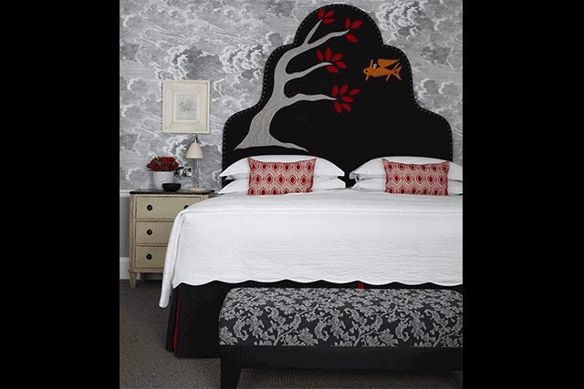 One of my favorite combinations is black, white, and red. It’s a classic style that still looks contemporary, and there are so many ways for the colors to work together. This Asafo-inspired headboard found in room 101 at the Haymarket Hotel is black with a witty appliqué of an airplane flying through clouds and an interesting embroidered windblown tree with red leaves. We have used vibrant dashes of red to awaken a contemporary combination of black and white. The soft textures of the Nuvolette Fornasetti cloudy wallpaper wrap this elegant Regency room. Indeed, the gray color palette enhances the vibrancy of the red touches.