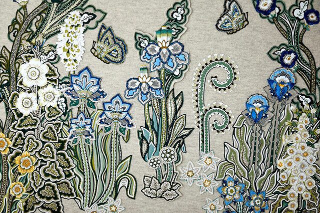 We wanted to create something exquisite. The creative process began when studying tapestries from the 15th and 16th centuries. Fascinated to see the magical creatures hiding behind leaves and under hedgerows, it inspired the idea to give them new life in a contemporary world. Artist Melissa White and I had fun taking this idea and transforming it into reality. We did not want to lose the hand-drawn effect and depth within the designs, so we spent weeks at the mills and wallpaper factories in the north of England, hand-selecting different background fabrics. Friendly Folk appears on a linen mix, Hedgerow on cotton twill, and Pear Tree on a chintz.