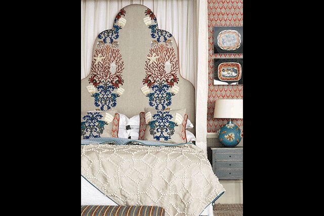 Turnell & Gigon represents wonderful textile companies such as California-based Raoul Textiles, whose fabrics are clear and bright; Jean Monro, whose traditional and handblocked fabrics we so admire; and Schumacher, whose fabrics are innovative and unique. Our Flora headboard is named after someone on my team, upholstered in Schumacher’s Under the Sea fabric, complete with coral embroidery. The fabric is calmed by the intricate but beautiful white-on-white linen half-tester around it. The cushions echo the theme, and so do the bedside lamps with coral and friendly fish circling the turquoise ceramic base.