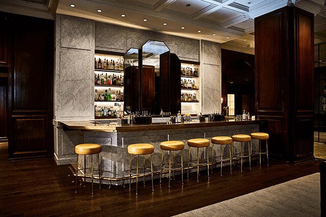 Custom mosaic floors greet guests at reception, while the upper lobby’s bar is fashioned from Carrara marble and raw brass. In the Drawing Room, a duo of antique limestone fireplaces from France were, despite structural challenges, painstakingly reassembled. Another highlight, says Taylor, was discovered upon removing layers of old carpeting in the French Room Salon: lustrous marble flooring illuminates the Adolphus’s graceful timelessness.