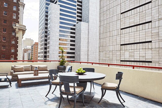 For nearly two and a half years, Swoon the Studio overhauled the Adolphus’s public spaces to make way for additions such as Spa Adolphus, which includes an alfresco relaxation area and the airy lifestyle boutique Commerce Goods + Supply. A residential feel was also conjured to complement the 407 upgraded guestrooms courtesy of local firm Design Duncan Miller Ullmann. Convivial, social brands like Ace Hotel were muses for the Adolphus’s dive into modernity, as were the grand yet refined spaces “visited on research trips, like Chicago Athletic Association and Bemelmans Bar in New York,” points out Taylor. Materials like original dark walnut paneling are melded with steel-frame windows, a homey collection of books, and artwork from the likes of artist Richard Serra.