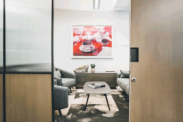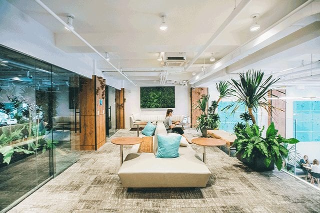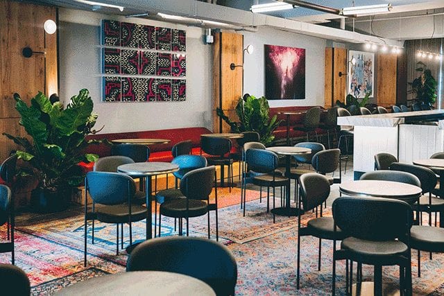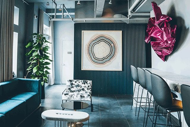 Spanning 12 floors and 38,000 square feet, “the building is programmed differently on almost every floor,” she says, with low-slung sofas populating the mezzanine level, a glass wall that separates meeting spaces, and a meditation room complete with gongs for sound baths, throw pillows, and floor poufs. To be truly connected to nature, the ground floor includes a plant-based bar that blends with the space’s deep teal and wine hues. The lobby features communal seating zones, while other areas, like meeting rooms, include custom desks crafted to match the partition system made from blackened steel, which allows members to customize the spaces to fit their needs. In the offices, a calming palette marries art, foliage, and moveable doors. But to connect the disparate spaces, dark wood, steel, and black furniture are found throughout, and accents like velvet drapery allow for an ambiance that is “more like home than work,” notes project manager Amanda Tomlinson.