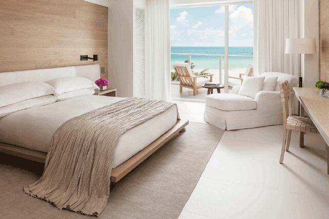 The 294 guestrooms meld cerused oak-lined walls with porcelain tile floors, lending an ethereal and airy beach house feel that blends effortlessly with the hotel’s pristine oceanside grounds. “I love the fluidity of the indoors and the outdoors,” says Yabu.