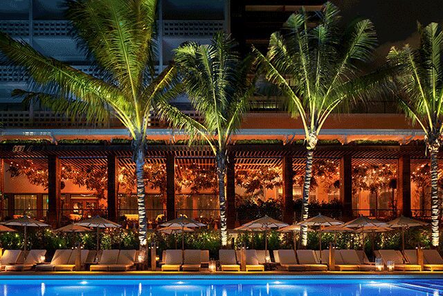 The design extends to the landscaped outdoor venues as well. The original pool was restored along with its ultra-mod diving tower, which is covered in bright pink flowers and vines. Tropicale restaurant features the Seville’s teak-wrapped sundial, while outdoor movie venue Sand Box is a decidedly modern and playful addition to the property.