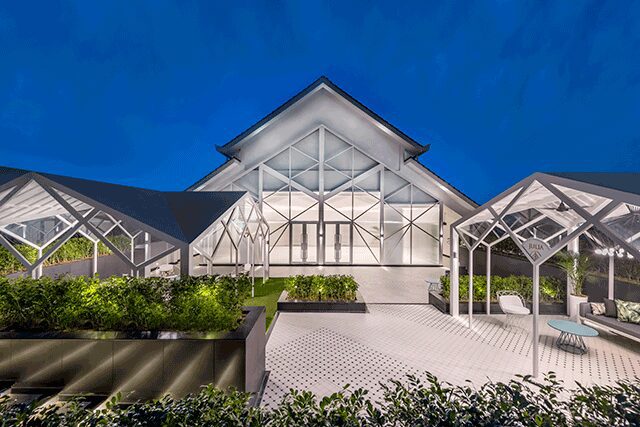 The top floor is home to the gym (decked out with chandeliers and mirrored ceiling panels) and two function rooms that lead to outdoor gazebos and an infinity edge rooftop pool that faces the waterfront and is the perfect place to watch the sunset, says Seah.