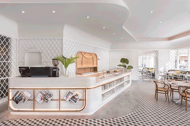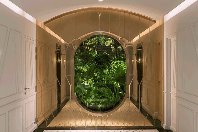 Adjacent to the reception area is the all-day dining restaurant the Glasshouse. Informed by English conservatories, sunlight pours into the open space, bouncing off white walls and trellis-inspired screens. “A mix of real plants and tropical prints were used for the sofa cushions to add to the allure of being in a tropical Eden,” says Seah. In another nod to the magical realism that pervades the interiors, the mirror that clads the end walls deliberately creates the effect of multiple rooms.