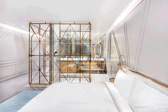 Meanwhile, in the 162 guestrooms, visual tricks abound, including hidden doors that reveal toilet cubicles and pantries. A favorite of Seah’s is the custom shower and wardrobe enclosure in the deluxe suite, which takes cues from elaborate props used in performances, such as Houdini’s escape box. “Whether you’re using it to shower and become its center of attention or admiring its details, its sheer spectacle,” he says.