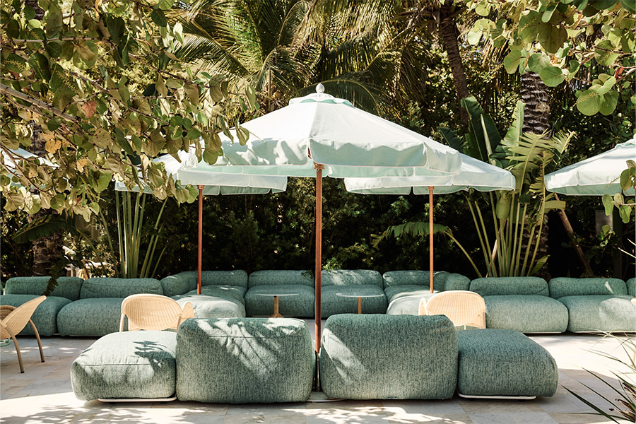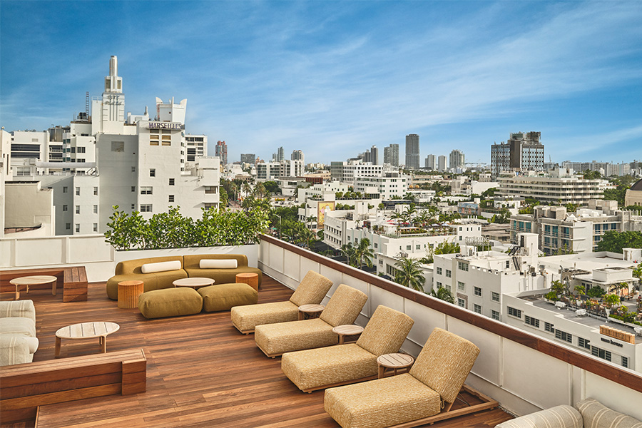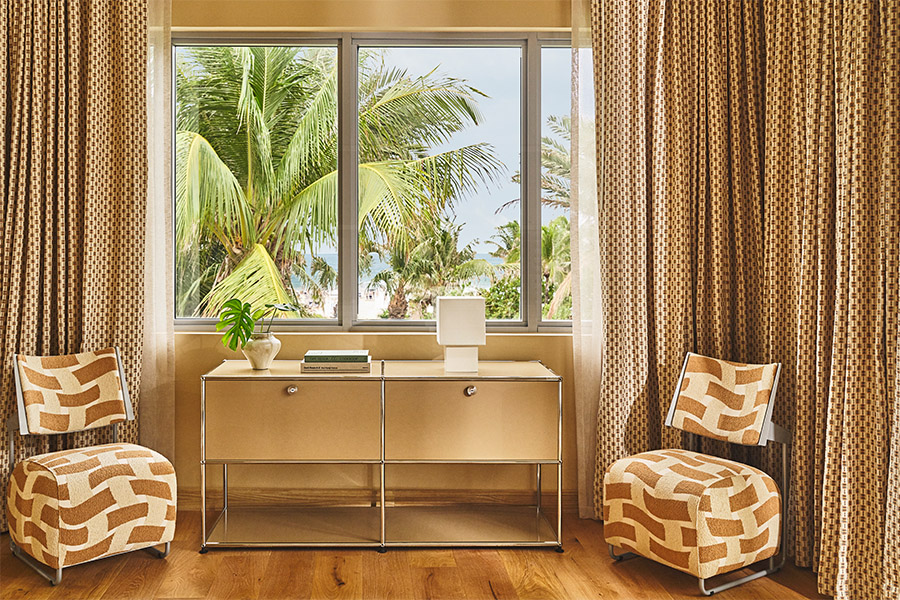 Yet, there were challenges. The Miami Design Preservation League’s strict oversight meant much of the exterior remains intact. Inside, original elements—like the red marble behind the reception desk, the “S”-monogrammed elevators, and the fanning Deco staircase at the lobby bar—were retained. “We always try to preserve as much as possible,” says Tuneu. “If we can’t preserve it, we try to recall it with our designs.”