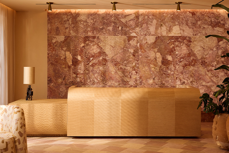 A standout of the hotel is the grand 4,000-square-foot lobby bar, centered on a bespoke Ceppo Beige stone bar. Upon it, a life-size sculptural vase adds an alluring organic form, while seating mixes upholstered stools, vintage armchairs, and Brutalist sofas in a Chanel-esque weave. “Proper likes to have signature moments when it comes to furniture,” says Clarke. Many pieces were built from reclaimed marble slabs found in an abandoned Spanish quarry. “No two are alike,” Clarke adds. “They have their own personalities.”
