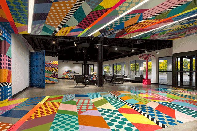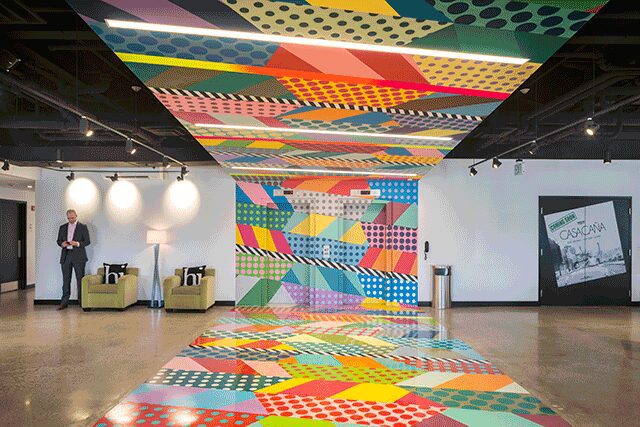 For the 117-room Studio Allston hotel in Boston’s Allston neighborhood, design firm Dyer Brown worked with art director Isenberg Projects to integrate new, thematic artworks in the lobby, bar, meeting rooms, suites, and guestrooms—all original, and most created by local artists. Twelve of them offer colorful new guestroom murals, like one by animator and director Maya Erdelyi. Five suites imagined as immersive works of art highlight New England landscapes by David Buckley Borden, drawings by Sophie Ainsley, and the space-age modernism of Jim Drain. “We created the canvas and the 17 artists worked with it, creating unique suites, elevators, and common area elements, including the lobby’s one-of-a-kind floor and wall installation,” says Deniz Ferendeci, director of asset design + support with Dyer Brown. “It creates a continuous story in every corner of the hotel. There were really no boundaries or limits to the ideas we imagined. We were told, shoot for the moon.”