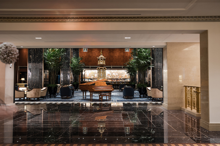 In Peacock Alley, Cole Porter’s custom-built Steinway piano from 1907 and the hotel’s iconic clock, designed for the 1893 Chicago World’s Fair, were both restored
