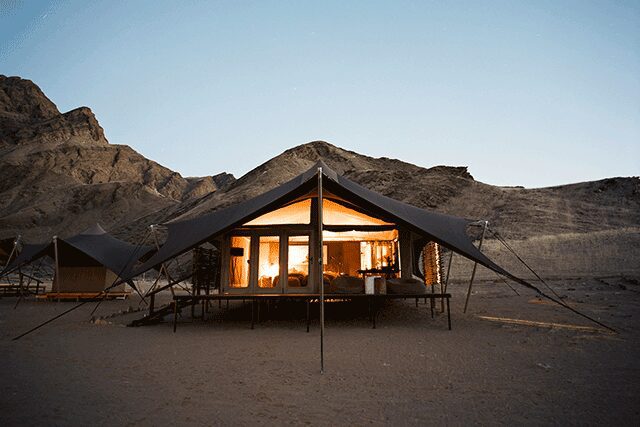Hoanib Valley Camp, Namibia: The remote Kaokoland region of the Skeleton Coast in Namibia is known as one of the world’s last true wilderness areas, with a sparse population of about one person for every mile. It is also the home of Natural Selection’s new Hoanib Valley Camp, surrounded by a landscape of rolling sand dunes, river beds, and wildlife-rich plains. The camp comprises six canvas tents raised on decks designed by Johannesburg-based Cate Simpson. Bedecked in dip-dyed linens, African artwork, and rattan furnishings, the upscale, sophisticated interiors belie their location in the desert while managing to effortlessly blend in.