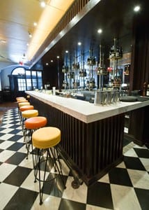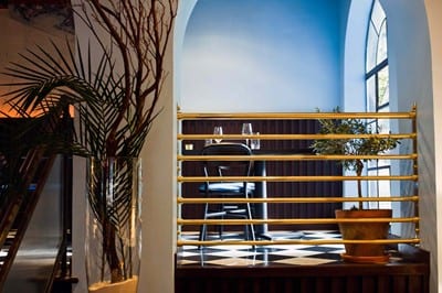 Aizaki outfitted the space with vertically ribbed walls, blue banquettes, wood tables, white and black checked floors, and pops of yellow and orange., while details such as brass accents, custom lamps, tile work, oversized mirrors, warm lighting, and millwork complete the welcoming look.