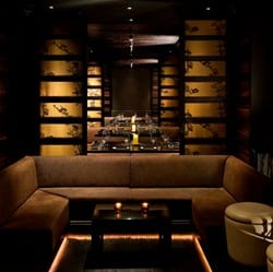 Expertly combined rosewood and sandstone offset the overall dark interiors and contribute to the intimate mood. These warm materials also offer the perfect foil to the imposing 26-foot-long long jellyfish aquarium behind the bar and the dramatic fiber optic light curtain that presides over the space and leads guests from the entrance to their seats. “It’s all about glamour and being seen before you are seated,” Godsk says.