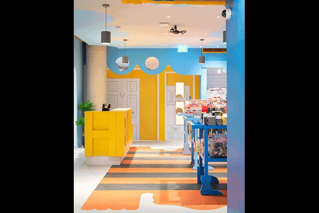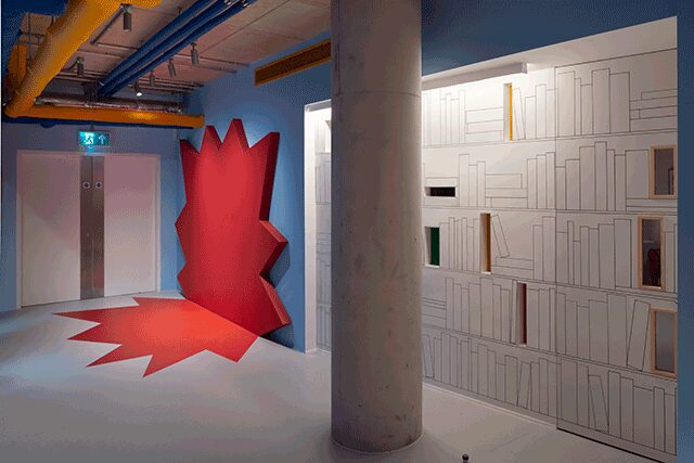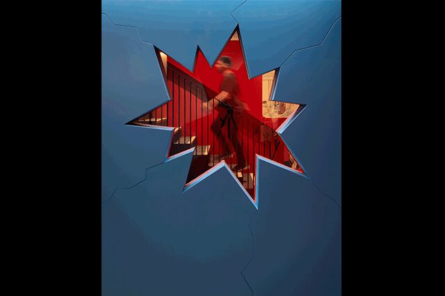 Channeling the vibrant chaos of the animated world, the Cartoon Museum in the Fitzrovia section of London hosts a 3D world where the laws of physics are defied—doors may appear too large or too small, and bookcases serve as secret portals to new discoveries. Designed by locally based practice Sam Jacob Studio, the layout draws inspiration from the frames of a cartoon strip through which visitors can choose various routes and spatial narratives that reflect a spectrum of possibility. Interiors are outfitted with graphic wall treatments reminiscent of the natural world, while neon signage, “Pow!” cutouts, and speech bubbles anchor visitors in an illustrated reality. “We drew on the language of cartoons, which often have very different kinds of places and scenes,” says the firm’s founder Sam Jacob. “We used the idea of being able to draw different types of space at different scales to bring some of that into the visitor’s experience. Sometimes you feel like you are in different locations, like a villain’s lair or a house.”