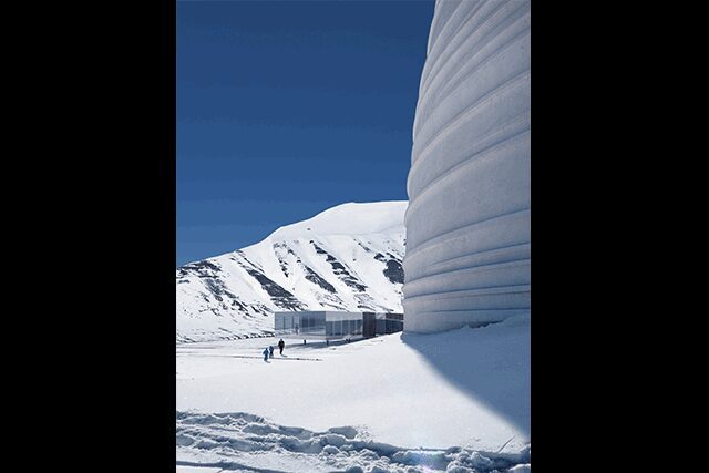 Home to only a few thousand people, Longyearbyen is a small Arctic town on Svalbard, an archipelago situated between Norway’s mainland and the North Pole. Here, Oslo- and New York-based Snøhetta designed a visitors center for arctic preservation that showcases items from the world’s largest secure seed storage (the Arctic climate makes the location perfect for this), houses a collection of historical digital assets from the Arctic World Archive, and—in collaboration with the Norwegian Natural History Museum—educates visitors on the archipelago’s geology and history. Clad in glass and burnt wood, the entrance building is suspended off the ground to prevent it from heating the permafrost, while the exhibition building, as striking as its surroundings, is accessed via a glass bridge and takes a monolithic form. At the center is the ceremony auditorium, with a bright, wooden interior that contrasts the darker wood on the building’s outer shell. As a call to action in response to the climate emergency, a deciduous tree—similar to those that used to grow on Svalbard millions of years ago when the temperature was eight degrees higher than it is today—is a visual representation of the conditions the area could return to in the next 150 to 200 years if global temperatures continue to climb apace.